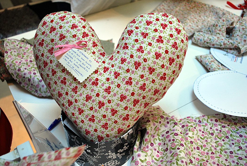 Se desarrolló en cadena de trabajo. Unos marcaban el patrón, otros cortaban, otros combinaban para conseguir corazones más bonitos, coser, rellenar, remate a mano, y finalmente empaquetado, al que se le unía tarjetas de buenos deseos, rellenadas por los asistentes y público que se acercaba.