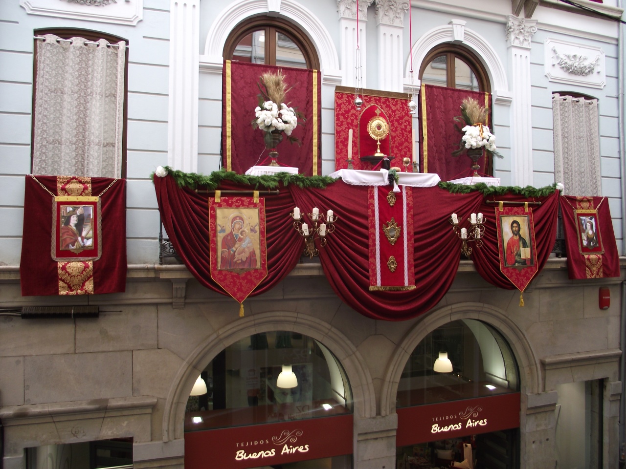 Esta mañana hemos estado dando los últimos retoques a nuestra fachada de la tienda de Mesones 27, con motivo de la festividad del Corpus 2014.
