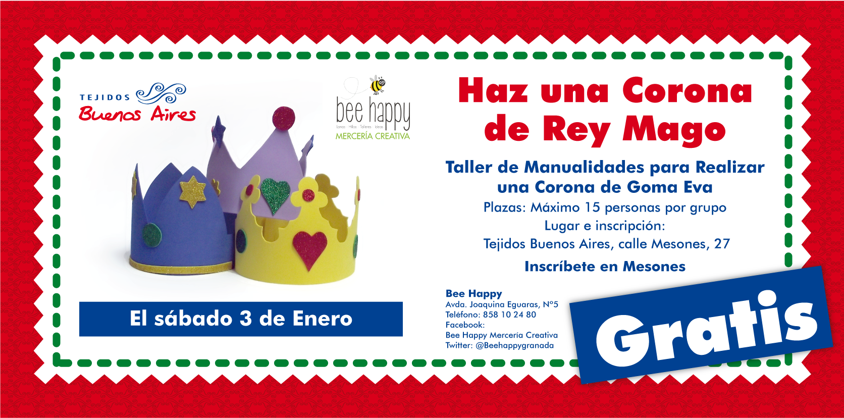 Para este sábado puedes apuntarte al taller que hemos preparado en colaboración con Lucia Ruiz de Mercería Bee Happy. Habrá 4 grupos, dos de mañana y dos de tarde, y haremos una corona de Rey Mago con goma eva.