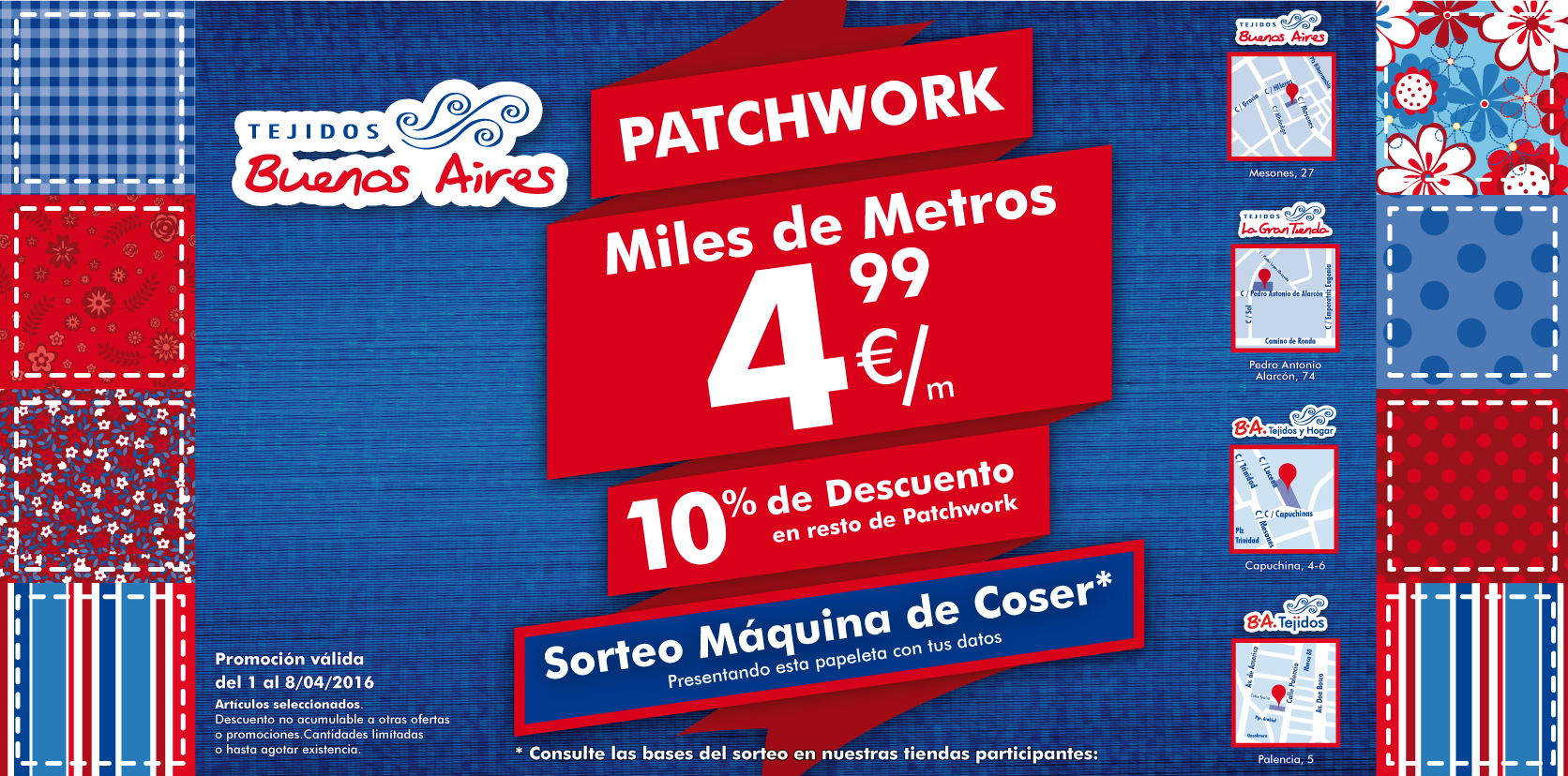 Que no sea porque no lo hemos dicho; hasta el viernes día 08 puedes comprar cientos de metros de patchwork a 4.99€/m. Además tienes la posibilidad de comprar todos los tejidos para manualidades con un 10% de descuento. Y también podrás participar, por tu compra, en el sorteo de una estupenda máquina de coser portátil, si lo deseas.