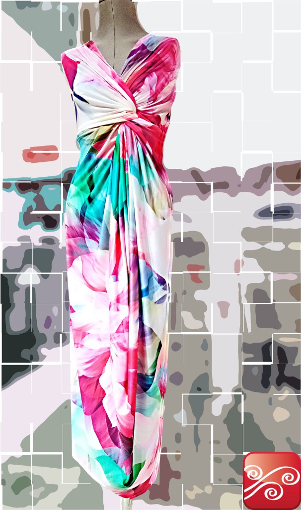 Vestido estampado de Crep elástico, con colores primaverales. Tejido elegante y llamativo.
